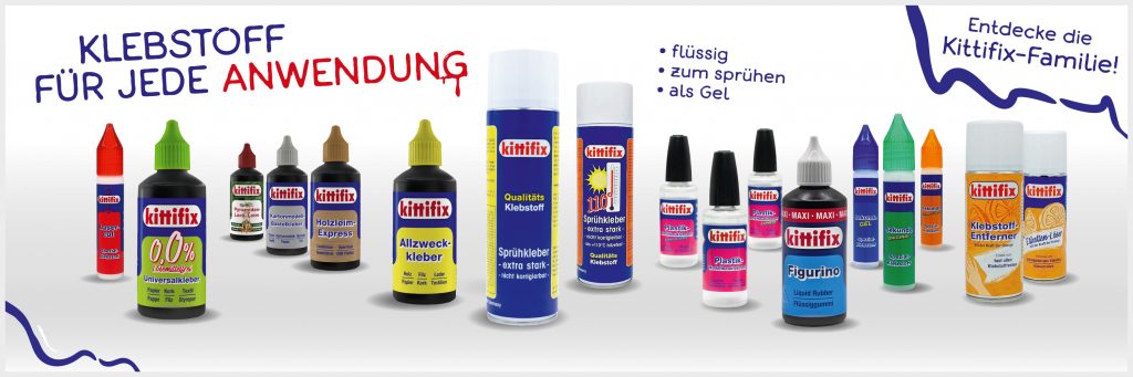 Heute bietet Kittifix, die seit vielen Jahren bekannte Marke, eine breite Palette von Klebstoffen und Zubehör für die Bereiche Modellbau, Schule Haushalt und Hobby an.
