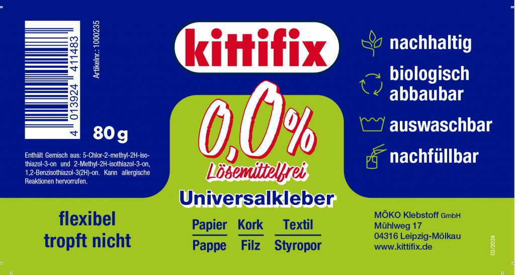 Der Bastelkleber ohne Lösungsmittel ist ein schnell abbindender Klebstoff, der für alle Arten von Bastelarbeiten geeignet ist. Er klebt alle gängigen Bastelmaterialien schnell und trocknet transparent. Kittifix 0,0% Lösemittelfrei Universalkleber klebt Papier, Karton, Leder, Stoff, Filz, Bast, Trocken- und Seidenblumen, Kork untereinander und auf vielen verschiedenen Kunststoffen, Metallen, Laminaten, Stein und Styropor®. Er kann auf nahezu allen Materialien verwendet werden, wenn einer der zu klebenden Teile porös oder saugfähig ist. Kittifix 0,0% Lösemittelfrei Universalkleber tropft nicht.